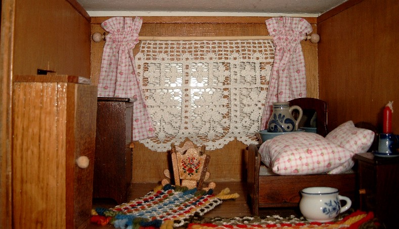 Die dazu gehörende Schlafkammer ist einfach möbliert mit einer schönen Wiege und Fleckerl-Teppichen