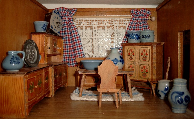 Die Wohnstube ist besonders schön mit Bauernmalerei-Schänken und Steingut-Geschirr eingerichtet