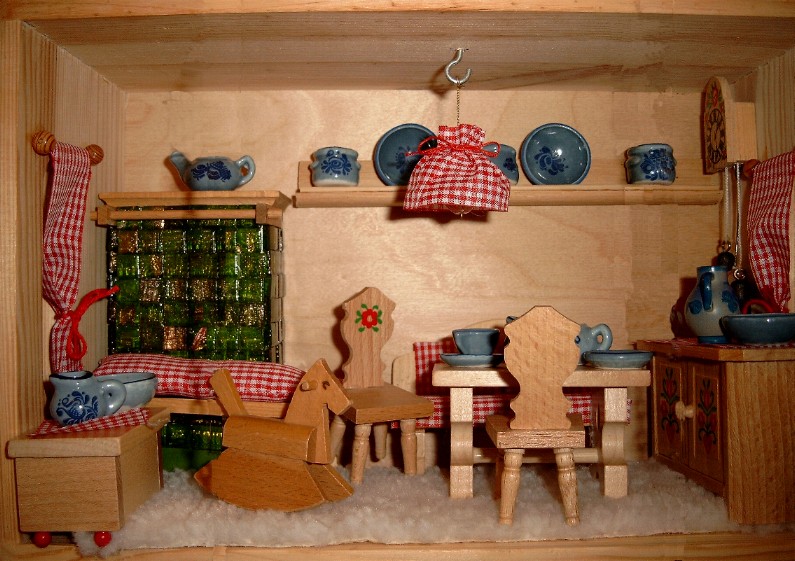 Diese Stube ist ein einzelner Kasten. Besonders schön: Der mit Mosaiksteinen verkleidete Ofen und die Steingut-Töpfe.