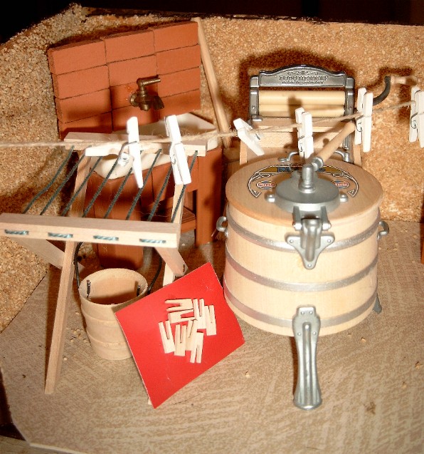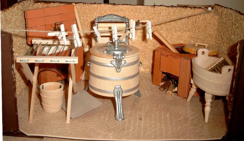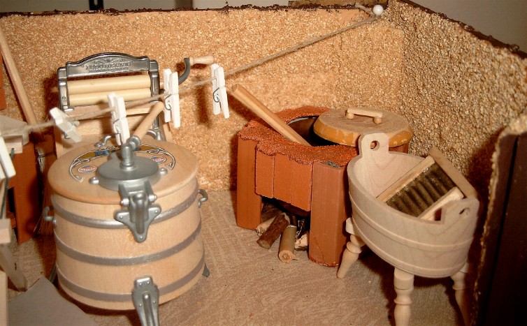Sie ist nach oben offen, die Wände sind mit Sand als Rauputz beklebt und in der Mitte steht die große Waschmaschine eines bekannten Puppenhaus-Ausrüsters. Puppenmuttis ganzer Stolz.